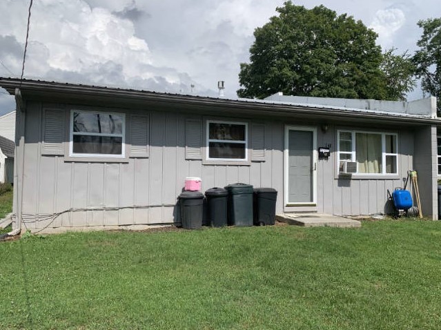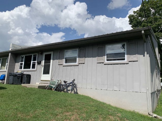 The grey building has four units each has 3 bedrooms and 1 bathroom in a ranch style (one floor) confirguration.